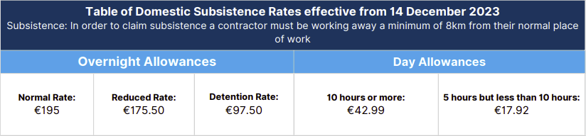 | Relocation Expenses Relocation expenses include vouched travel costs to Ireland and accommodation costs for the first 3 months of a specific contract. Subsistence rate: If you have relocated specifically for a contract but haven ‘t sourced accommodation, a subsistence rate of €195 per night may be permitted for the first 10 nights of the contract. After the initial 10 nights, you must provide receipts for rent expenses. Under relocation expenses, the cost of travel to Ireland may also be included as a business expense (i.e Flights / Ferry / Train). Where a contractor has relocated within Ireland, the vouched diesel / petrol costs may be permitted as a business expense for the initial trip to the place of relocation. |