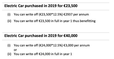 With Electric Vehicles you have to option to accelerate the write off, this would mean claiming the full €24,000 in year 1.