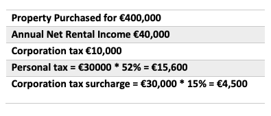1. Tax on Income generated from Rental income is 25%, this will rise to 40% should the profit remain in company for more than 18 months. If you extract the profit you will be liable to up to 52% tax on the income.