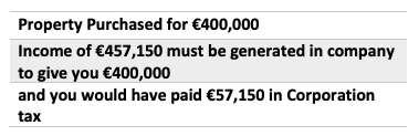 1. The cost of the property cannot be written off against Profits. Income generated to build up funds in the company will be subject to 12.5% Corporation tax (in some cases a surcharge of approx. 7% will apply), therefore you have already paid corporation tax on the amount that you have in the company