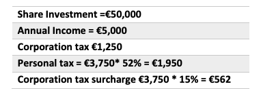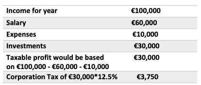 - The cost of the investments cannot be written off against Profits. Income generated to build up funds in the company will be subject to 12.5% Corporation tax (in some cases a surcharge of approx. 7% will apply), therefore you have already paid corporation tax on the amount that you have in the company